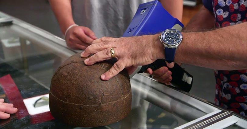 在這一期節(jié)目中,一位顧客帶來(lái)了一個(gè)被認(rèn)為是鐵做的頭盔。一位專家證實(shí),這是一個(gè)約有1500年歷史的真正的盎格魯-撒克遜頭盔。這頂頭盔完好無(wú)損,是一件非常罕見(jiàn)的古董。通常情況下,鐵會(huì)在有氧氣存在的環(huán)境中分解,因此這個(gè)頭盔很可能被遺留在如沼澤或河流等的缺氧環(huán)境中而得以完好保存。