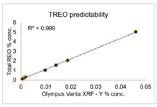 圖3. Vanta手持式XRF光譜儀基于所測到釔的含量可以準確預測總稀土氧化物的含量。
