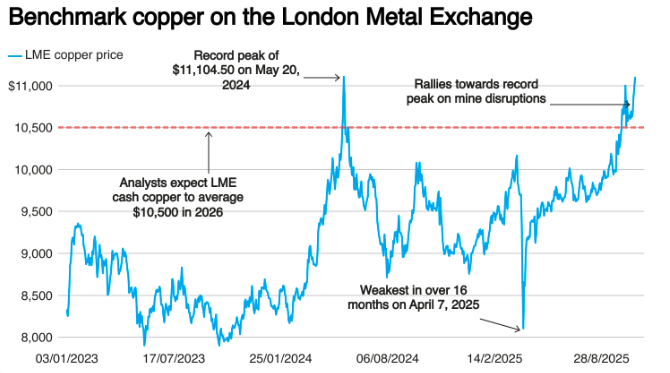 業內30位分析師的預測中值顯示,2026年LME現貨銅均價料為10500美元/噸,較7月份上次調查的9796美元預測上調了7.2%。