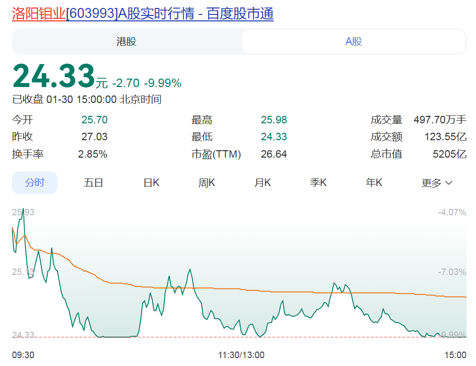 1月30日,A股有色金屬板塊震蕩下行。截止1月30日下午3點收盤,洛陽欒川鉬業集團股份有限公司(以下簡稱“洛陽鉬業”)總市值達到5205.24億元。盡管與上一個交易日相比,有不小的跌幅,但依然維持在5000億元以上的高點。