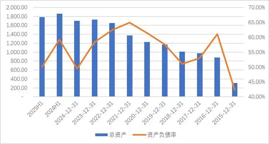 圖:近十年總資產及資產負債率,單位:億元