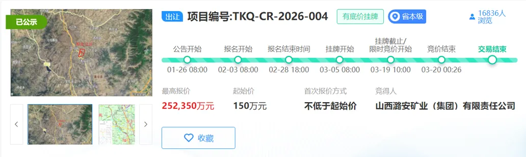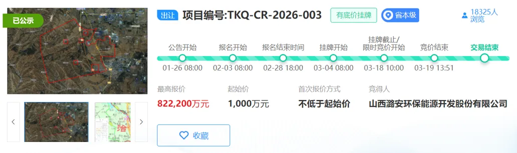 山西省自然資源網(wǎng)上交易平臺顯示,該區(qū)塊起拍價1000萬元,最終成交價為82.22億元,溢價高達822倍,創(chuàng)2026年以來山西省內(nèi)煤炭探礦權(quán)成交價新高。